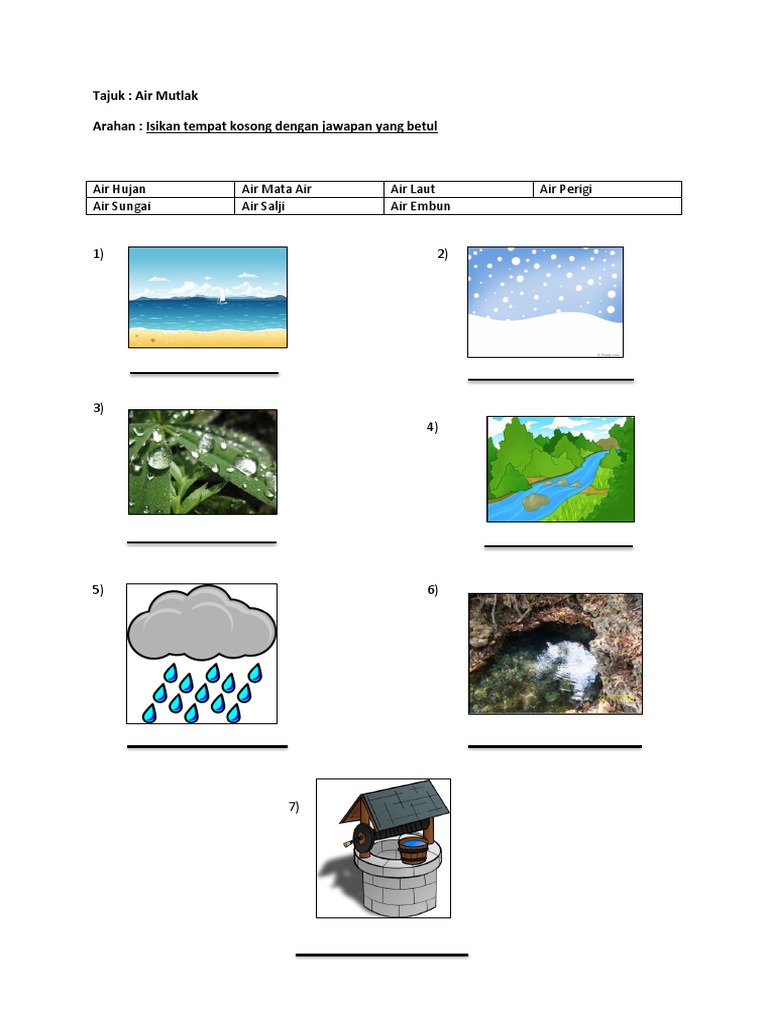 1 from • apabila cukup sukatan atau timbangan air itu dua kolah maka ia tidak menjadi najis oleh sesuatu melainkan apabila berubah. Musta'amal adalah air yang telah digunakan untuk bersuci. Menyumbang sekitar 0.6 persen dari total air di bumi. Dan apakah jenis air mutlak? 1.air hujan 2.air laut 3.air sungai 4.air telaga 5.air mata air 7.air salji. Air adalah sumber utama dan ianya sangat penting dalam kehidupan kita seharian. Air suci dan menyucikan adalah jenis air mutlak yang sumbernya berasal dari langit (hujan) serta sifatnya tidak berubah. Air hujan, salju, es, air embun, air sumur, mata air, telaga, danau, dan juga air laut.