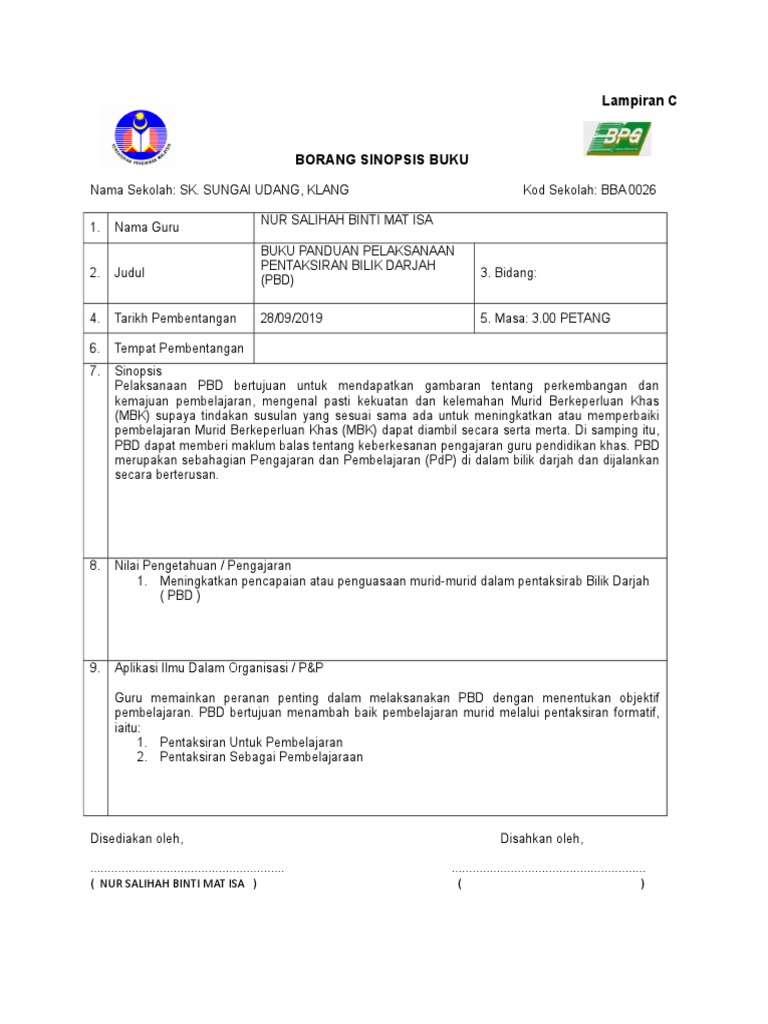 Lampiran c borang sinopsis buku nama sekolah: