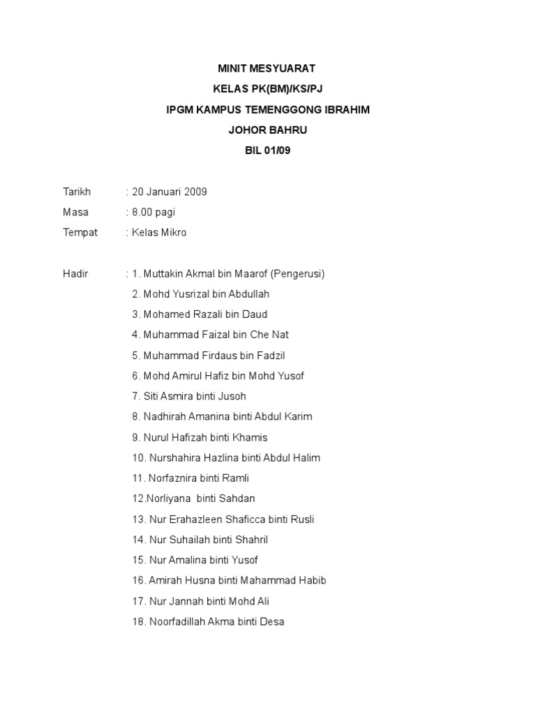 Mesyuarat minit perlu perbincangan terperinci, keputusan dan tindakan yang diambil. Salvarsalvar contoh minit mesyuarat ringkas para ler mais tarde. Bilik gerakan, smk majakir papar m/sur par perkara tindakan maklum balas at a 5 5.1 buku pengoperasian program penyelaras. Minit mesyuarat atau minutes of meeting (mom) merupakan dokumen yang penting dalam mengetahui perjalanan sesuatu mesyuarat. Telah disahkan tanpa sebarang pindaan.